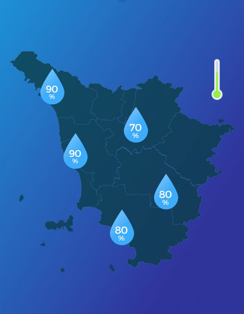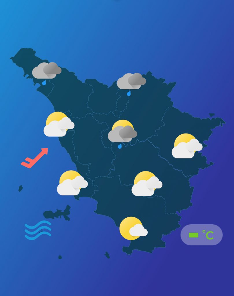 Mercoledì, ci sveglieremo con un cielo coperto, e le prime precipitazioni sparse sull'Alta Toscana in estensione dal pomeriggio verso le zone interne centrali e settentrionali. I venti deboli da sud, sud-ovest con rinforzi sulla costa e sulle zone sottovento all'Appennino. Rotazione a ovest, nord-ovest nel corso del pomeriggio, forti sulla costa a sud di Livorno e sull'Arcipelago. Mari molto mossi, in aumento fino ad agitati in serata a nord dell'Elba con possibile mareggiata. Le temperature in diminuzione con locali gelate nella notte e nelle prime ore del mattino.