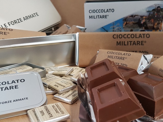 Qualità ed energia, il Cioccolato Militare è un fondente al 70% e si presenta avvolto nella confezione storica delle Forze Armate, pensato oggi per esigenze di utilizzo in diversi formati: il “cubo” da 50g, 100g e la tavoletta da 200g. Completano la linea i cioccolatini da 5g ciascuno, disponibili anche in uno speciale astuccio di metallo, come si usava una volta ed una crema spalmabile, anche questa in tubetto di alluminio per l’uso sportivo.