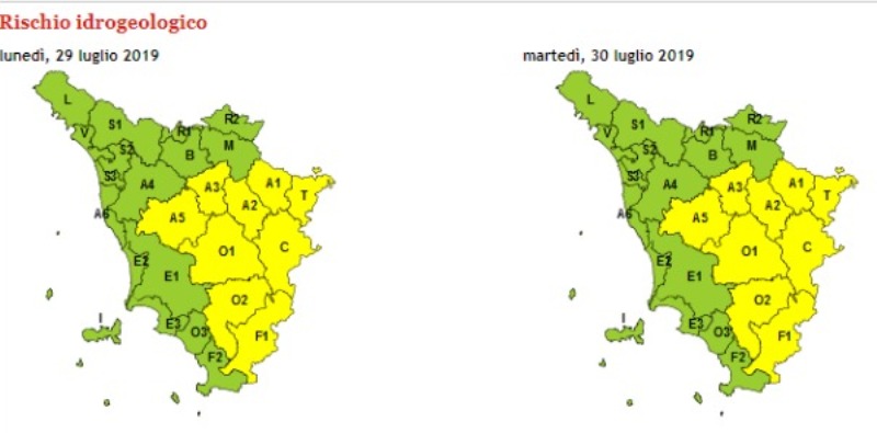 La Sala di Protezione civile della Città metropolitana di Firenze segnala che lunedì 29 e martedì 30 luglio è emanato un codice giallo per rischio idrogeologico e idraulico nel reticolo minore nelle aree del Valdarno Superiore, Arno-Firenze e Valdarno Inferiore: possibili locali precipitazioni a carattere di rovescio o isolato temporale.