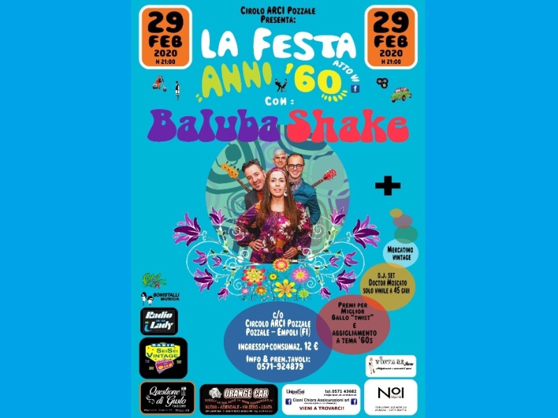 Sabato 29 febbraio dalle h 21:00 si inizia con "Moscato D.J." che mixerà usando rigorosamente vinili d'epoca a 45 giri. Alle 22:00 il concerto dei Baluba Shake, la più nota '60s band toscana , con un repertorio tutto da ballare per scatenarsi al ritmo di twist, shake, beat & surf!