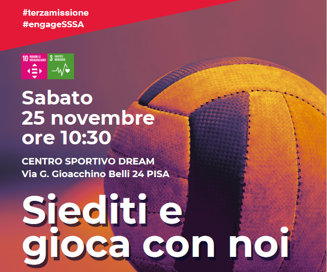 . “Siediti e gioca con noi” a sitting volley, sfidando le campionesse europee. In preparazione della Giornata internazionale delle persone con disabilità, la Scuola Superiore Sant'Anna, in collaborazione con l’associazione sportiva Dream Volley Pisa, ha organizzato, per sabato 25 novembre (inizio ore 10.30) a Pisa, presso il Centro sportivo Dream in via Belli 24, un torneo dimostrativo di sitting volley, disciplina paralimpica riconosciuta dal 2013.