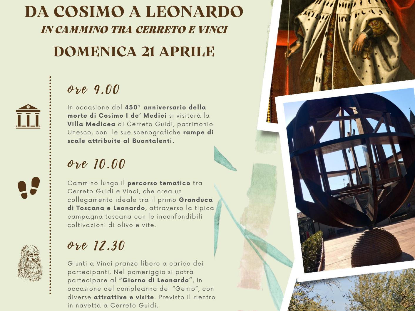 Il primo appuntamento è previsto per domenica 21 aprile con la passeggiata Da Cosimo a Leonardo. In occasione del 450° anniversario della morte di Cosimo I de’ Medici, il tour inizia con la visita esclusiva della Villa Medicea di Cerreto Guidi, patrimonio Unesco. Si prosegue il cammino lungo il percorso tematico tra Cerreto Guidi e Vinci accompagnati da una guida storico ambientale. Giunti a Vinci, si potrà partecipare al “Giorno di Leonardo” in occasione del compleanno del “Genio”, con diverse attrattive e visite. Il rientro potrà essere effettuato a piedi o in pulmino.