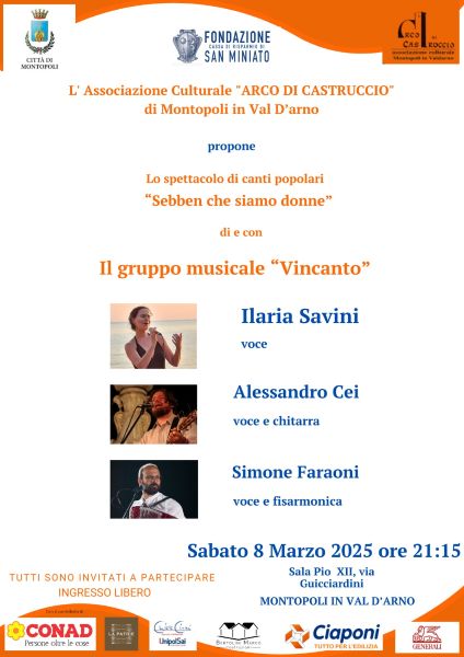 Sabato 8 marzo, alle 21:15, alla Sala Pio XII in via Guicciardini a Montopoli in Val d'Arno andrà in scena lo spettacolo di canti popolari Sebben che siamo donne del gruppo musicale Vincanto. L'evento è proposto dall'Associazione Culturale Arco di Castruccio e patrocinato dal Comune di Montopoli e dalla Fondazione Cassa di Risparmio di San Miniato.