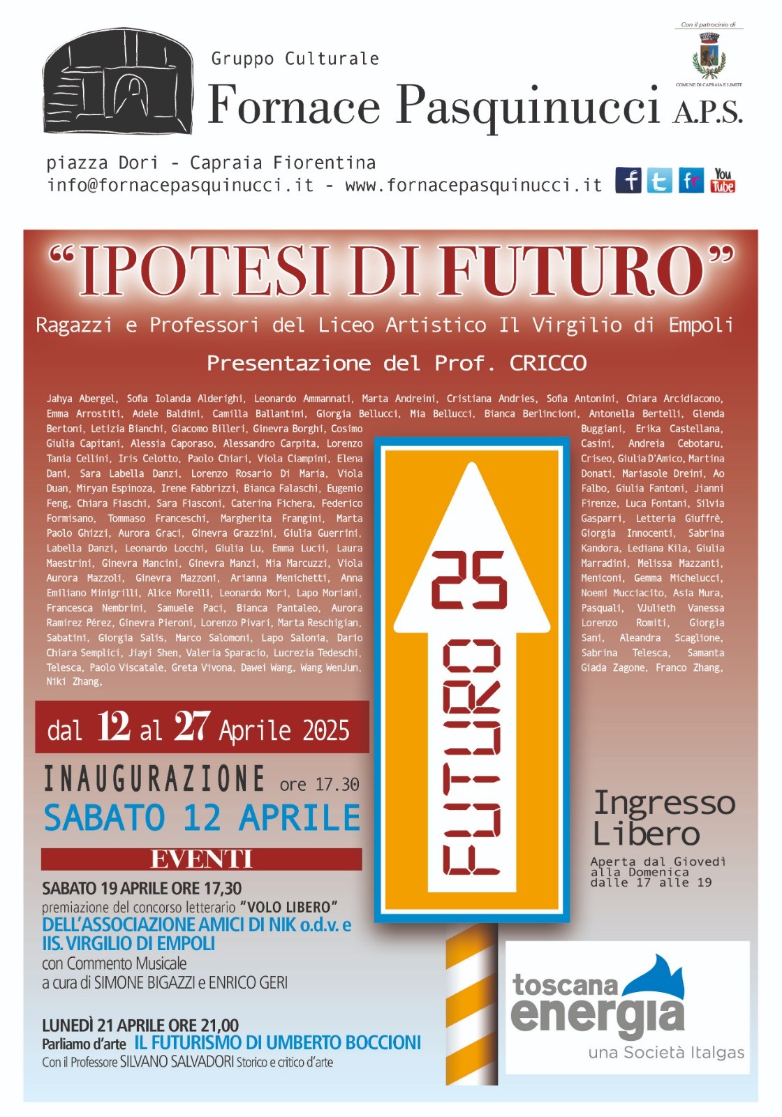 Il Gruppo culturale Fornace Pasquinucci aps ospita la mostra “Ipotesi di Futuro 25” che verrà inaugurata il prossimo Sabato 12 aprile, alle ore 17,30, Piazza Dori, snc -Capraia , dove per consuetudine ormai decennale torneranno ad esporre le loro opere gli studenti frequentanti terzo, quarto e quinto del Liceo Artistico Virgilio di Empoli. Anche quest’anno i docenti metteranno in mostra le proprie opere, confondendole per scelta con quelle dei ragazzi, affiancandoli silenziosamente ma con orgoglio nell’ esperienza .