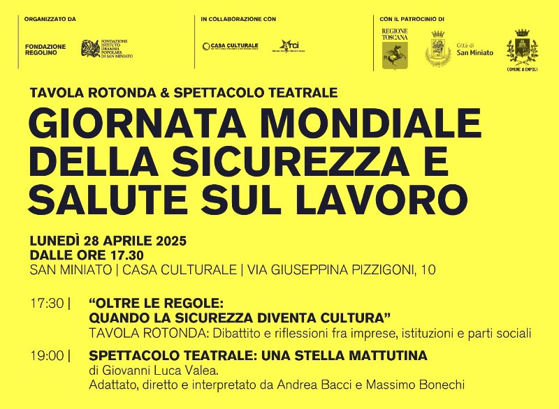 In occasione della Giornata Mondiale della Sicurezza e Salute sul Lavoro, la Fondazione Regolino e il Dramma Popolare di San Miniato presentano con orgoglio lo spettacolo teatrale “Una stella mattutina”, in programma lunedì 28 aprile 2025 alle ore 19 presso la Casa Culturale di San Miniato di Via Pizzigoni 10. L’iniziativa è organizzata dalla Fondazione Regolino e dal Dramma Popolare di San Miniato, in collaborazione con ARCI e Casa Culturale di San Miniato, e patrocinata dalla Regione Toscana, dal Comune di San Miniato e dal Comune di Empoli.