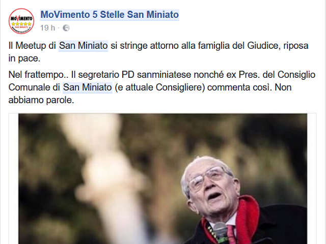 Un brutto scivolone ripreso dal M5S San Miniato sulla propria pagina Facebook: parliamo del commento del segretario locale Pd, ex presidente del Consiglio comunale e ora membro dell'assise, Simone Giglioli alla notizia della morte del giudice Ferdinando Imposimato, giunta ieri martedì 2 gennaio. La notizia sta girando proprio sui social network, ed è giusto fare alcune precisazioni. Il commento è vero (rispondendo in merito alle molte richieste pervenute anche in redazione sulla possibilità che fosse un fotomontaggio) ed è stato fatto sulla bacheca privata di un amico di Giglioli. In nostro possesso abbiamo anche un altro screenshot di un commento molto simile, fatto sempre da Giglioli sulla bacheca di un altro conoscente. A qualche ora di distanza la notizia è stata diffusa dai grillini di zona, ribadendo la vicinanza alla famiglia del giudice (Imposimato negli ultimi anni ha fatto diverse esternazioni positive verso i 5 Stelle e questi ultimi avevano fatto il suo nome per le elezioni del Presidente della Repubblica nel 2013 e nel 2015). Il commento di Giglioli è stato cancellato poco dopo da entrambe le bacheche e il consigliere comunale, interpellato di gonews.it, ha ritenuto di non commentare la vicenda. La caduta di stile è stata condannata su Facebook anche da altri membri del consiglio comunale, ossia Chiara Benvenuti (M5S) e Laura Cavallini (Immagina San Miniato).