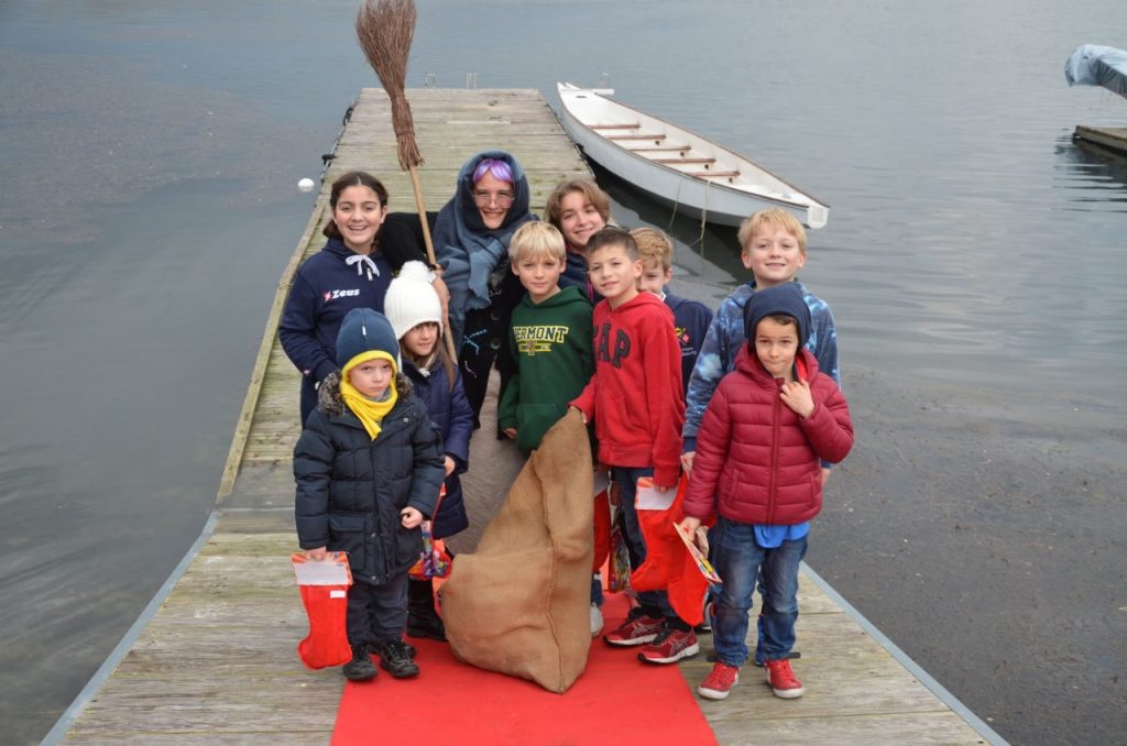 Erano già pronte dalla mattina le calze che sono state riposte in una balla. I ragazzi intanto avevano preparato un dragon boat, barca orientale a 10 vogatori e dopo aver imbarcato la Befana si sono diretti verso il pontile di sbarco dove erano ad attenderli un gruppo di bambini con i genitori che all’arrivo della imbarcazione  dove si trovava la Befana hanno applaudito a lungo  Una volta scesa dall’imbarcazione la Befana ha consegnato ai bimbi presenti la calza.