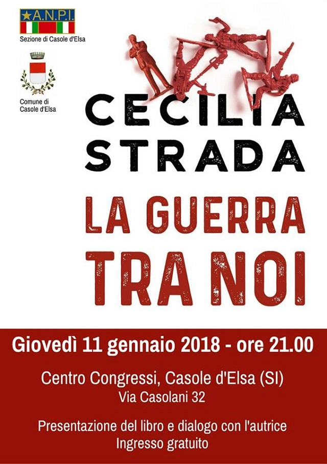 Si chiama "La guerra tra noi" il primo libro di Cecilia Strada, edito da Rizzoli, che verrà presentato a Casole d'Elsa giovedì 11 gennaio. "Sono andata lontano per capire quello che succede qui", si legge sulla copertina. La figlia del fondatore di Emergency racconta attraverso parole come sicurezza, pancia, assedio, storie di guerra e di paura, che partono dal G8 di Genova e toccano l'Afghanistan, il Sudan, l'Iraq. La sua è una riflessione sulle storie e le situazioni che ci sembrano lontanissime ma alle quali in realtà siamo tristemente collegati da un sistema in cui ognuno di noi ha un ruolo. L'appuntamento è alle ore 21.00 presso il Centro Congressi di Via Casolani.
