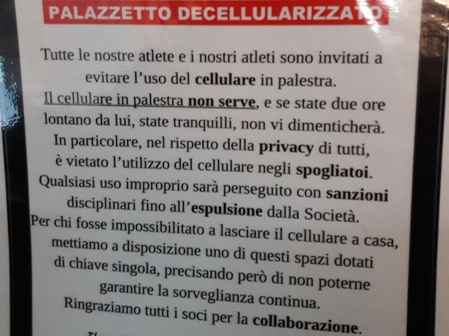 Il concetto è semplice: si viene in palestra a fare sport, il cellulare non serve a niente. Perchè portarsi il cellulare in palestra e negli spogliatoi? In quelle due/tre ore è giusto pensare ad allenarsi e a divertirsi con le proprie compagne. Socializzare, ma guardandosi negli occhi, divertendosi mentre si fa attività fisica. Per spippolare hanno tempo tutto il resto della giornata e come abbiamo scritto nel cartello accanto al "deposito cellulari": non preoccupatevi, quando uscite dall'allenamento, il vostro cellulare vi riconoscerà, non vi avrà dimenticato. In questo modo si possono evitare anche spiacevoli episodi, come scattare foto o girare filmati che potrebbero finire in rete, a volte soltanto per scherzo e provocare problemi."
