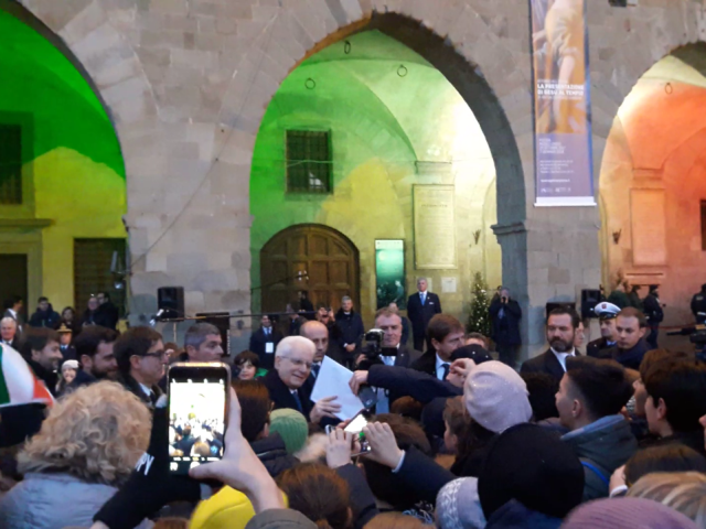 Nei mesi precedenti gli alunni delle terze classi B e C della Scuola Media avevano svolto, sotto la guida delle loro insegnanti, un lavoro sulla Costituzione Italiana intitolato “La Costituzione in classe e a Barbiana” e pochi giorni prima della visita del Capo dello Stato a Pistoia, i ragazzi hanno chiesto di andare – come ci raccontano le insegnanti – a consegnare il loro elaborato accompagnandolo con una lettera indirizzata al Presidente Mattarella. Ma non sembrava facile raggiungere lo scopo e i ragazzi hanno temuto fino all’ultimo di non riuscire ad avvicinare Il Presidente, finché il plico è quasi volato sulle teste della folla radunata in Piazza del Duomo il 1 dicembre ed è arrivato nelle mani di Mattarella, proprio grazie all’intervento di uno studente della Leonardo che aveva raggiunto le transenne.
