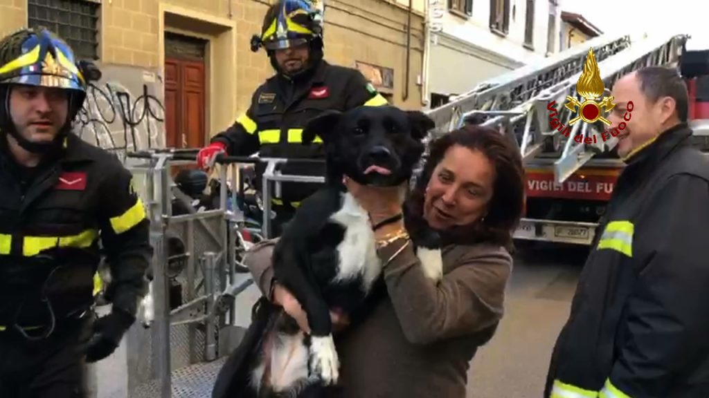 Un cane si e' avventurato lungo il cornicione posto al primo piano di una palazzina, per poi fermarsi sul davanzale di una finestra, in via Vittorio Emanuele. I vigili del fuoco hanno recuperato il cane con l'ausilio dell'autoscala, per poi riconsegnare l'animale tra le braccia della sua padrona.