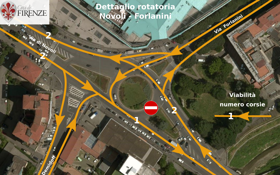 È stata predisposta una segnaletica ad hoc per indicare ai veicoli i percorsi alternativi. Ovvero per i mezzi che da via di Novoli devono arrivare in via Forlanini l’itinerario via Torre degli Agli-viale Guidoni e rientro in via Forlanini; oppure in seconda battuta, ma sconsigliato per il transito nel tratto a una sola corsia, via di Novoli-viale Redi-Ponte Mariti-via Mariti-Ponte di Mezzo per arrivare in via Forlanini.