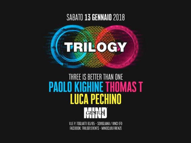 Il sabato sera è finalmente alle porte e come di consueto al Mind Club di viale Togliatti non mancherà la musica più innovativa e coinvolgente del momento. Da vera fucina del genere techno domani sera, sabato 13 gennaio, si esibiranno alla consolle del club tre artisti che hanno deciso di unire in maniera indissolubile le loro strade. Tre artisti che tra gli anni ’80 e ’90 hanno fatto ballare intere generazioni nei locali di maggior tendenza d’Italia e d’Europa e che oggi hanno creato il grande progetto collegando le loro strade: il progetto Trilogy. Loro sono Luca Pechino, Thomas T e Paolo Kighine.