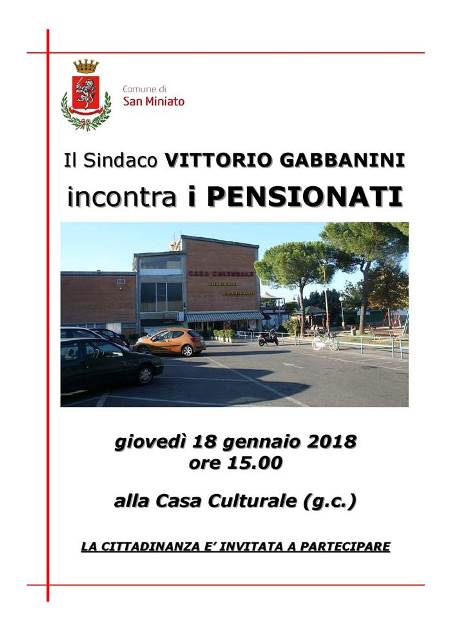 Giovedì 18 gennaio alle 15 presso la Casa Culturale di San Miniato Basso, il sindaco Vittorio Gabbanini incontrerà i pensionati per confrontarsi con loro sulle tematiche di maggiore interesse.