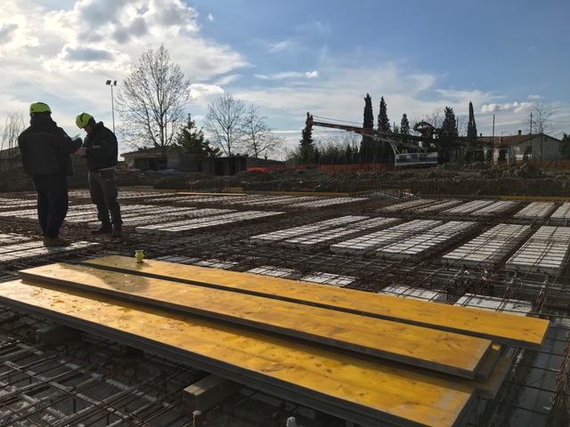 “Tra pochi giorni- ha aggiunto il direttore dei lavori Stefano Torre- potrà dirsi concluso il getto del primo solaio che chiude la fase delle opere in cemento armato portante della struttura principale. Subito dopo verranno realizzati i riempimenti dell’esecuzione dei marciapiedi e i cordoli di piede della struttura. Tra dieci giorni si potrà così iniziare con le opere della struttura in elevazione in legno”.