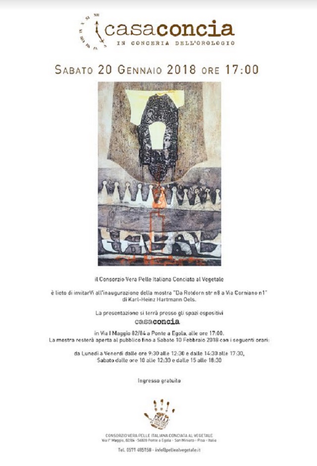 Si terrà Sabato 20 Gennaio alle ore 17.00 l’inaugurazione della mostra “Da Rotdorn str. n8 a Via Corniano n1” dell’artista Karl-Heinz Hartmann Oels. L’esposizione si terrà all’interno degli spazi espositivi del Consorzio Vera Pelle Italiana Conciata al Vegetale, denominati casaconcia. La mostra “Da Rotdorn str. n8 a Via Corniano n1” è il primo evento artistico del calendario di appuntamenti in programma per l’anno 2018. Un secondo anno di attività che si pone l’obiettivo di proseguire sulla strada dei buoni risultati ottenuti nella scorsa annata e di far diventare lo spazio espositivo, attraverso questo progetto, uno dei centri culturali di riferimento di Ponte a Egola e non solo. Lo spazio espositivo casaconcia ospiterà dunque per questo appuntamento Karl-Heinz Hartmann Oels, artista riconosciuto e stimato. Tra gli spazi che hanno ospitato le esposizioni dell’artista ricordiamo: Villa Pacchiani a Santa Croce sull’Arno, la Chiesa di San Francesco a San Miniato, la Facoltà di Matematica e Fisica dell’Università degli Studi di Pisa e la Galerie Utermann di Dortmund (Germania)
