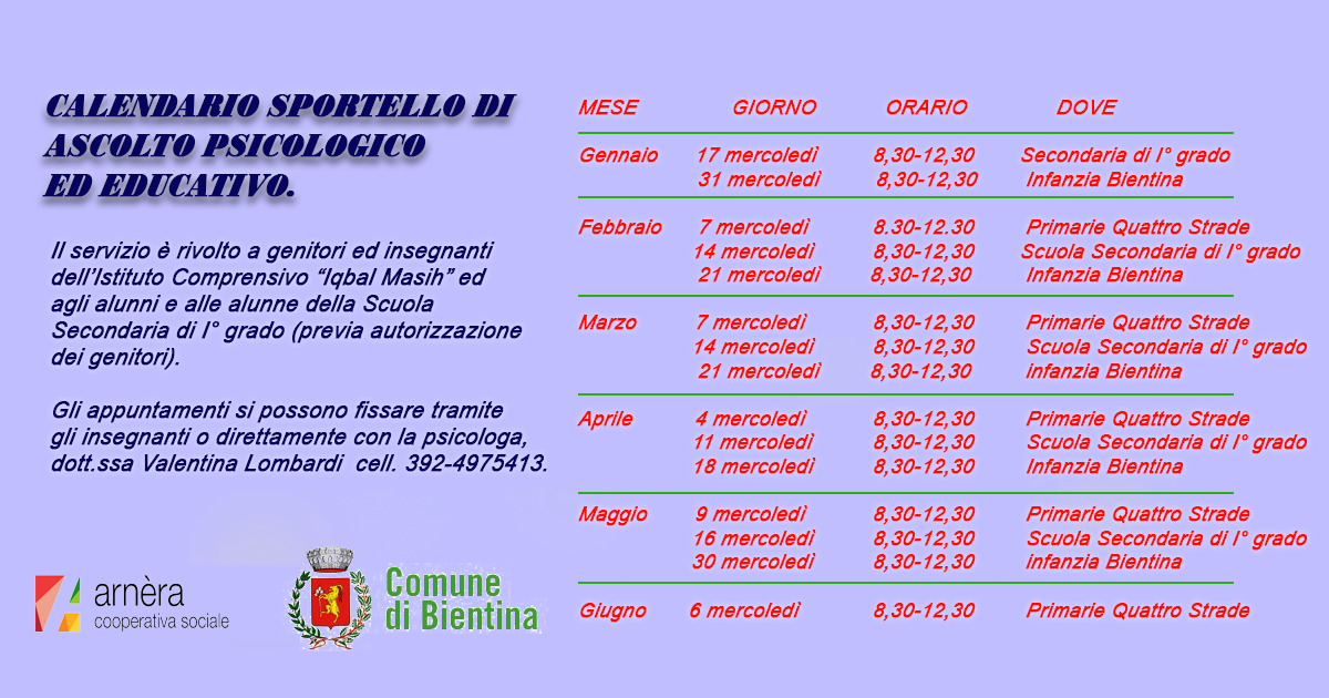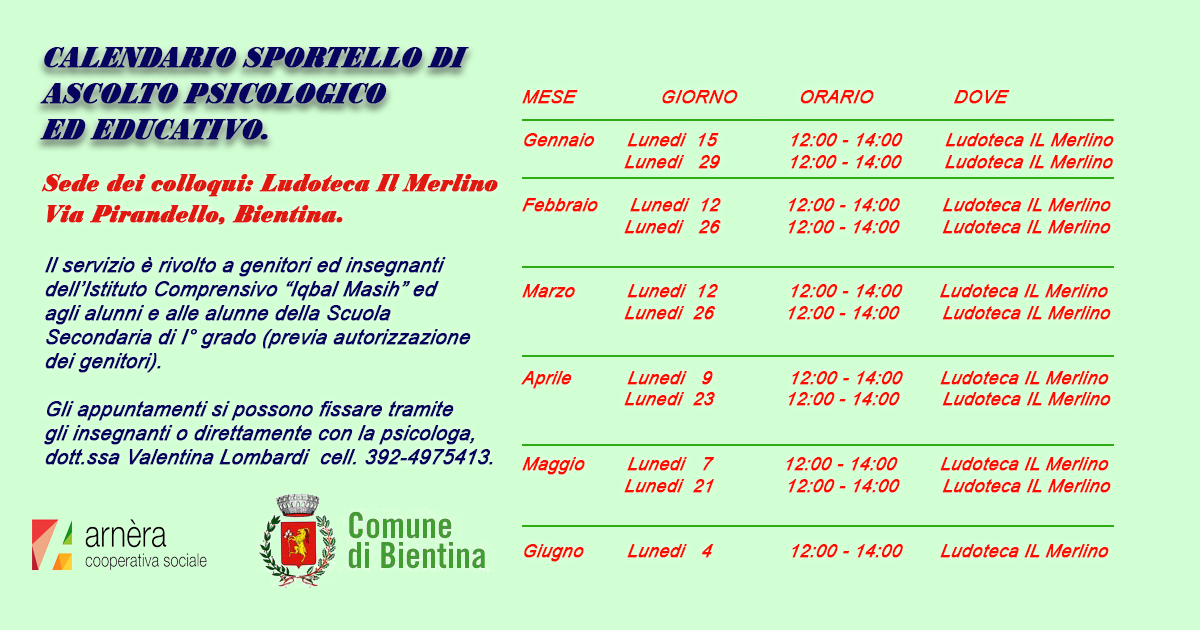 L’amministrazione di Bientina mette a disposizione uno sportello di ascolto psicologico/educativo per genitori ed insegnanti mediante il servizio Ciaf “Il Merlino”.