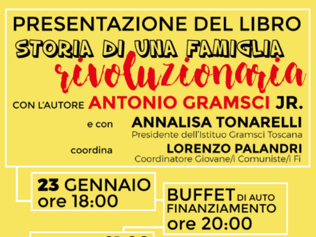 Martedì 23 gennaio 2017 a partire dalle ore 18.00 Antonio Gramsci Jr, sarà a Firenze, presso il Circolo Arci Il Progresso, per la presentazione del suo romanzo. Al dibattito, assieme all’autore, saranno presenti Annalisa Tonarelli, Presidente dell’Istituto Gramsci Toscano, e Lorenzo Palandri, coordinatore dei Giovani Comunisti di Firenze. Dalle 21.30, Gramsci, che prima di essere scrittore è un abile musicista (proprio come il padre Giuliano e la nonna Julia) si cimenterà in un concerto di musica Mediterranea.