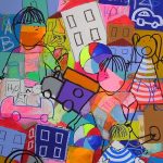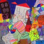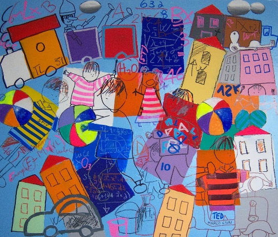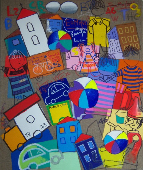 Narrazione e labirinti onirici, luoghi senza spazio, in contesti temporali riconoscibili, sembrano sfidare l’osservatore nei rompicapo di un quiz, metterlo alla prova nel gioco delle differenze. Ecco che dalla babele di forme e colori affiorano oggetti-simbolo, auto e lattine di famosi marchi di fabbrica, prodotti per la casa, cabine telefoniche, tazze e caffettiere, scarpe e racchette da tennis. Riempire gli spazi della memoria serve a realizzare il sogno di un bambino cui il senso del gioco non è mancato, mentre sono mancati gli oggetti con cui esprimere la voglia di libertà.