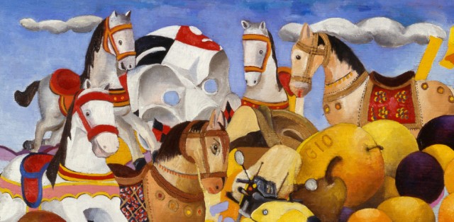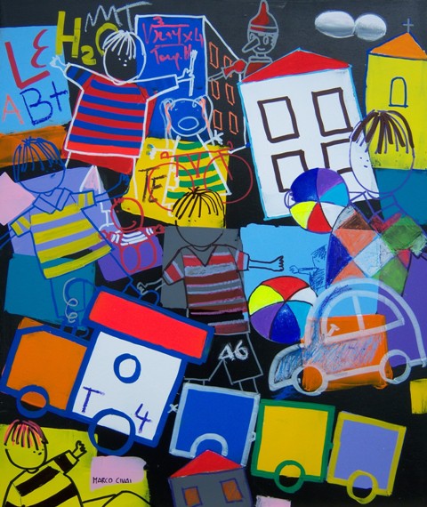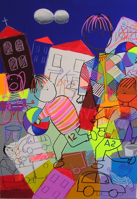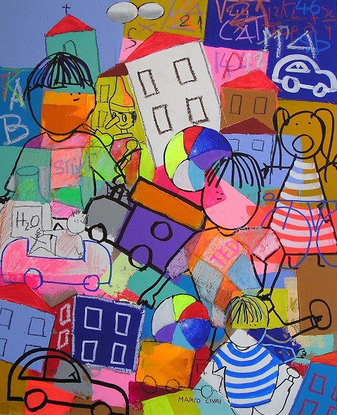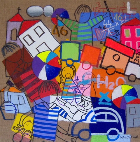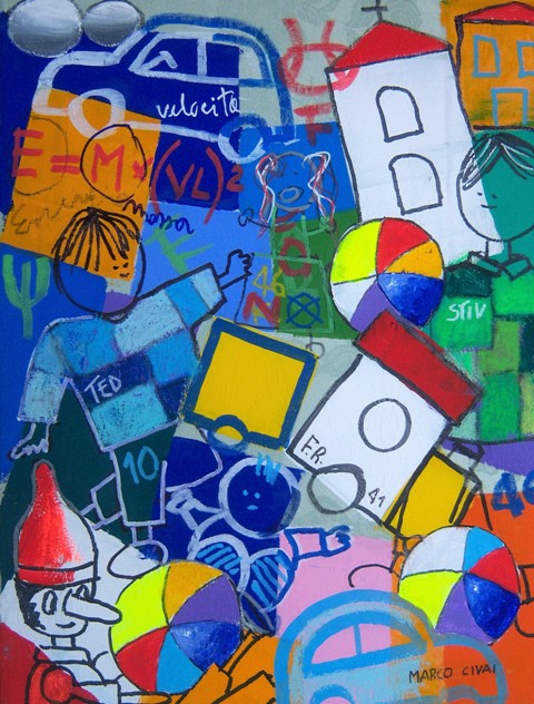 Mai dimenticare di essere stati bambini. Una folla di ricordi, una somma di emozioni accalcate negli angoli più remoti e inconsapevoli della memoria di un bambino, storicizzate e agganciate al tempo reale da oggetti di consumo e di uso quotidiano, prendono vita nel parco delle meraviglie di Marco Civai. Una giustapposizione di colori, rituali, simboli, tecniche che interpretano il giocattolo come una porta di accesso alla parte più intima dell’uomo, alle radici e agli albori dell’esistenza e delle relazioni con il mondo. Pinocchi, cavallucci, tricicli, trattori, tamburi e clown sembrano contendersi lo spazio angusto di una cantina, di una soffitta o semplicemente l’angolo giochi, ricco e disordinato, di una stanza aperta, priva di confini, dove sogno e fantasia fluttuano in libertà. In realtà è la galleria variopinta di un desiderio incontenibile, della memoria di un bambino che da adulto continua a crescere nel viaggio del tempo vissuto, intento a ripercorrere il legame indissolubile con il mondo dell’infanzia, con quel paese dei balocchi che rappresenta un eterno pozzo dei desideri, una fonte di ispirazione inesauribile per la vita reale.