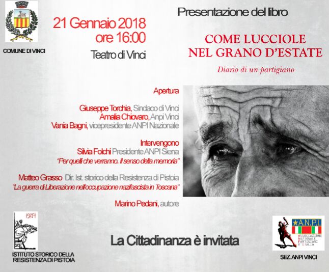 "Domenica 21 gennaio, alle ore 16, presso il teatro della Misericordia di Vinci, la sezione Anpi di Vinci presenterà "Come lucciole nel grano d'estate - Diario di un partigiano", un libro di Marino Pedani, Partigiano e Presidente onorario della sezione.