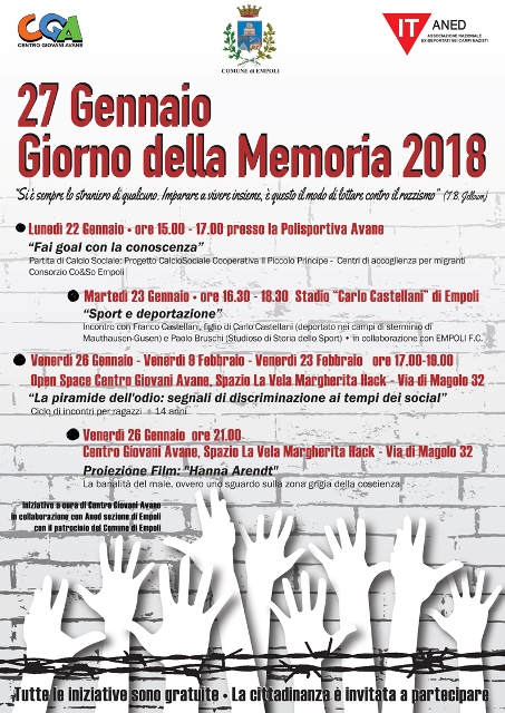 Le iniziative si apriranno lunedì 22 Gennaio alle ore 15 presso la Polisportiva Avane con la partita di Calcio Sociale, il Progetto portato avanti dalla Cooperativa Il Piccolo Principe e dal Centro di Accoglienza di Empoli con i ragazzi dei Centri di accoglienza straordinaria gestiti da CO&SO Empoli. La partita sarà introdotta dall’assessore allo Sport del Comune di Empoli e dal Presidente dell’ANED, sezione Empoli.