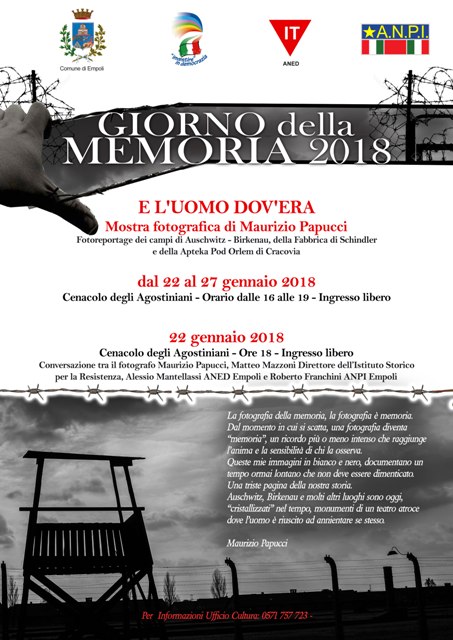 È prevista una mostra-fotoreportage realizzata da Maurizio Papucci, visitabile al Cenacolo degli Agostiniani dal 22 al 27 gennaio, in orario dalle 16 alle 19, ingresso libero. L’iniziativa rientra nel progetto comunale ‘Investire in Democrazia’ ed è stata realizzata in collaborazione con l’Aned e l’Anpi di Empoli. Inoltre, avrà anche un momento di incontro con il fotografo stesso.