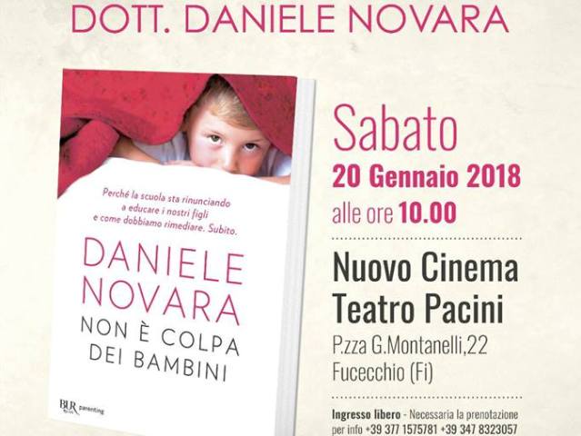 Sabato 20 gennaio alle ore 10 al Teatro Pacini di Fucecchio è in programma un incontro con quello che molti reputano il più celebre pedagogista italiano: Daniele Novara. L’appuntamento è di particolare interesse perché sarà presentato il suo ultimo libro dal titolo "Non è colpa dei bambini", un testo nel quale Novara spiega perché il nostro sistema troppo spesso preferisce la terapia all’educazione e illustra come ridare ai bambini la scuola e la società di cui hanno bisogno. L’evento, ad ingresso gratuito, è promosso dalla Biblioteca Comunale “Indro Montanelli”, da Blume Libreria, e da Scuola in Natura. Per informazioni: 377.1575781 o 347.8323057.