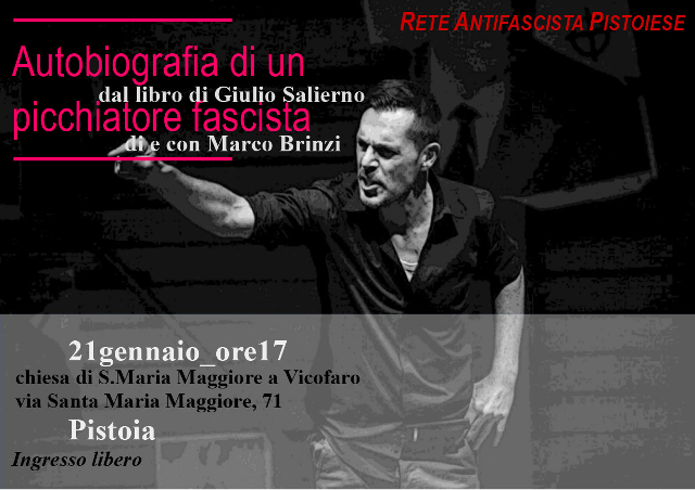 Si tratta di un racconto-monologo dal titolo "Autobiografia di un picchiatore fascista", tratto dall'omonimo romanzo di Giulio Salierno e riadattato, oltre che rappresentato, dal lucchese Marco Brinzi, noto attore e regista di teatro, cinema e televisione, ma anche appassionato militante antifascista.