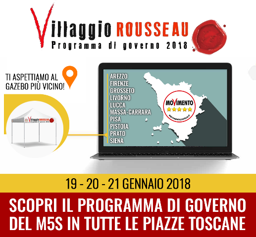 Il 19 – 20 – 21 Gennaio il Movimento 5 Stelle scende in piazza per illustrare il programma elettorale in contemporanea con l’evento nazionale Villaggio Rousseau a Pescara ( http://bit.ly/2DjAmi3 ). L’evento sarà proiettato in streaming in alcuni banchetti dai quali partirà l’opera informativa realizzata da attiviste e attivisti, portavoce, candidati e candidate alle parlamentarie.