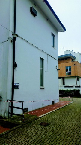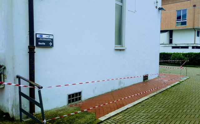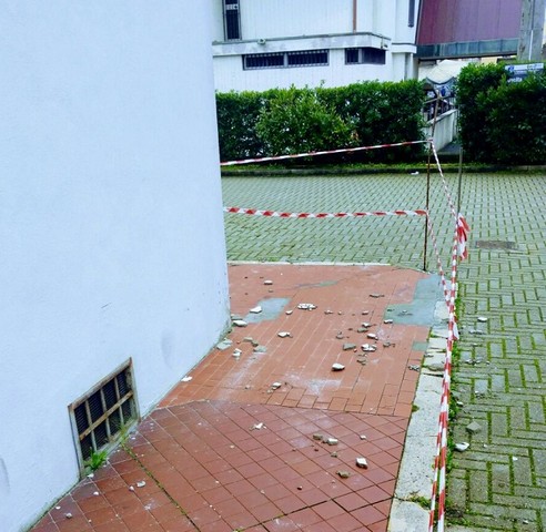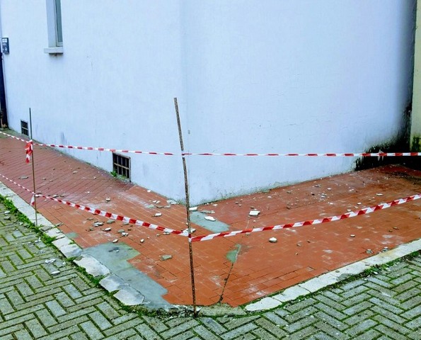 Caduta di calcinacci e area transennata in via Mainardi a Santa Croce sull'Arno, dietro il palazzo dell'Asl. L'area è stata transennata per impedire che ulteriori cadute di detriti possano colpire un passante. Non è chiaro quando sia avvenuto il distacco.