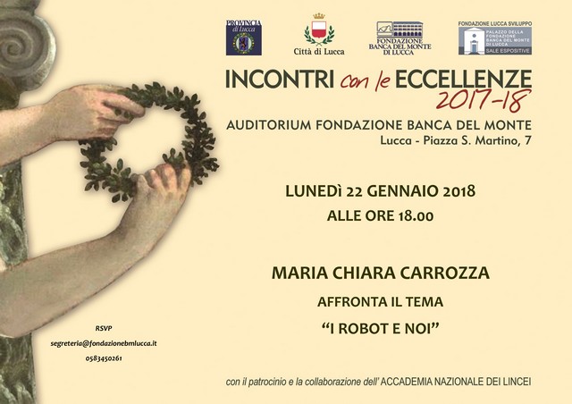 Robot: futuro o presente? Studenti, docenti e dirigenti delle scuole superiori del territorio parteciperanno, insieme a chi opera a vario titolo in ambito robotico, informatico, biomedico, bioingegneristico, filosofico, sociologico e antropologico, all’incontro con l’Eccellenza dal tema “I Robot e noi: presente e futuro di un mondo che è già cambiato” con la professoressa Maria Chiara Carrozza della Scuola superiore Sant’Anna di Pisa, che lunedì 22 gennaio alle 18 apre il calendario 2018 degli appuntamenti organizzati dalla Fondazione Banca del Monte di Lucca insieme a Fondazione Lucca Sviluppo e Comune di Lucca, in collaborazione con l’Accademia Nazionale dei Lincei.