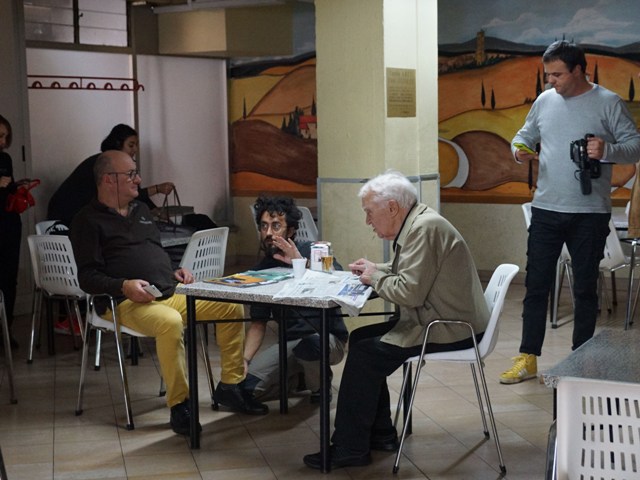 Ripartono proprio da qui le riprese di «Perché mi guardi così?», dopo le scene girate a Vicchio, nel Mugello, e in Val di Lima e dopo aver scaturito la curiosità di chi si trovava per caso alla Casa culturale di San Miniato durante le ultime riprese di inizio novembre, quando i “consuoceri” sul set, Alessandro Gelli e Sergio Forconi, hanno girato la scena in cui, seduti al tavolino del bar, progettavano le vite dei loro corrispettivi figli.