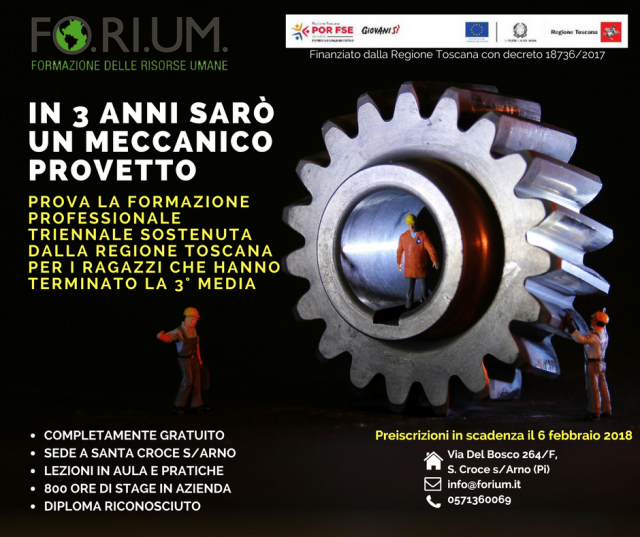 Nel Comprensorio del Cuoio arriva una nuova opportunità per i ragazzi che terminano la terza media e vogliono scegliere il proprio percorso formativo. È il progetto di istruzione e formazione professionale per 'Operatore meccanico - Addetto alla lavorazione, costruzione e riparazione di parti meccaniche' con durata triennale e sede a Santa Croce sull'Arno, gestito dalla Cooperativa Forium. Il corso è totalmente gratuito e nessun iscritto dovrà versare quote, nemmeno comprare libri scolastici che verranno forniti direttamente a lezione. Questo grazie al fatto che il progetto è stato finanziato dal decreto regionale toscano 18736/2017 con contributi del Fondo sociale europeo 2014-2020, nell'ambito dell'attuazione del programma 'Giovanisì'.