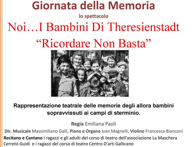 A Cerreto Guidi, quest’anno, la riflessione è affidata a uno spettacolo curato dall’Associazione La Maschera per la regia di Emiliana Paoli. Lo spettacolo promosso dal Comune di Cerreto Guidi, è intitolato “Noi… I Bambini di Theresienstadt -Ricordare non basta”.