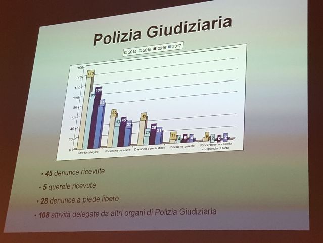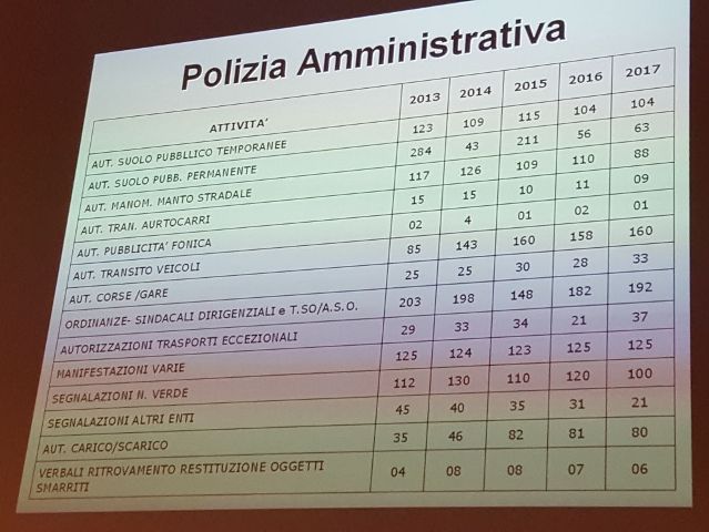 Tra le attività di Polizia Amministrativa si registra lo stesso numero di autorizzazioni all’utilizzo del suolo pubblico, 104 per il 2016 e il 2017, mentre dai controlli effettuati alle attività commerciali non è emersa alcuna significativa irregolarità. Diminuiscono le attività di Polizia Giudiziaria, in particolar modo per quanto riguarda il numero di denunce ricevute al Comando e per le attività delegate da altre forze dell’ordine.