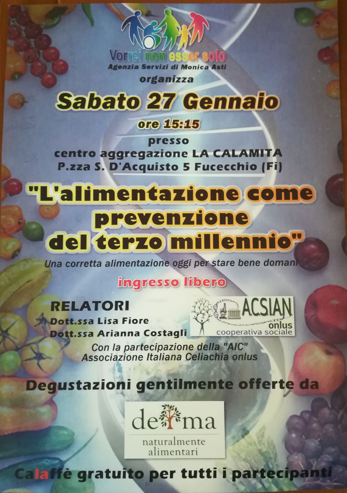 L'Agenzia di Servizi 'Vorrei non esser solo' organizza per il prossimo sabato 27 gennaio, alle ore 15.15 al centro La Calamita di Fucecchio, l'incontro dal titolo 'L'alimentazione come prevenzione del terzo millennio'. Parleranno la Dott.ssa Lisa Fiore e e la Dott.ssa Arianna Costagli. 5Ingresso libero.
