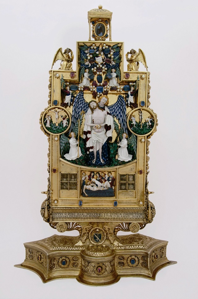 Il reliquiario, formato da una teca centrale in oro destinata a contenere preziose reliquie, è eseguito con una tecnica preziosa e difficile, quella dello smalto ‘en ronde bosse’ che permetteva di ricoprire il metallo di colori splendenti anche nelle parti in aggetto. La lucentezza di questo materiale gareggia con quello delle gemme e delle perle.