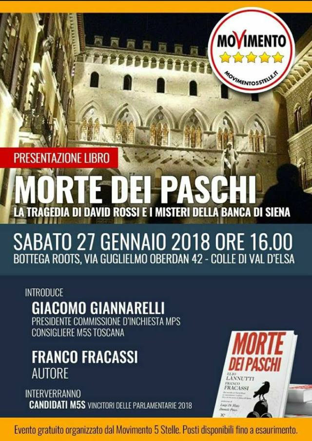 Il M5S invita la cittadinanza a partecipare alla presentazione del libro “Morte dei Paschi” che si terrà Sabato prossimo 27 Gennaio 2018 a Colle di Val d’Elsa (SI) presso i locali del Bottega Roots, in Via Oberdan 42 (Casa del Popolo – p.zza Unità dei Popoli) a partire dalle ore 16.00. L’evento è organizzato dal gruppo del MoVimento 5 Stelle Colle di Val d’Elsa e la partecipazione è gratuita. Nel corso del pomeriggio, interverranno uno degli autori del libro, Franco Fracassi, e il consigliere alla Regione Toscana del M5S Giacomo Giannarelli.