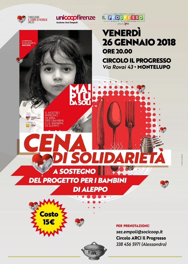 Venerdì 26 gennaio alle ore 20,00 la Sezione Soci Coop di Empoli, insieme al Circolo arci “Il Progresso di Montelupo, organizzano una cena di solidarietà a sostegno del progetto della Fondazione Il Cuore si scioglie onlus per i bambini e le bambine di Aleppo, vittime da anni di una guerra insensata che ha lasciato solo macerie e grossi traumi.