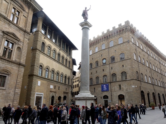 Il monolito collocato in piazza Santa Trinita, davanti alla chiesa omonima, è un dono del 1560 di Papa Pio IV alla casata medicea e proviene dallo spoglio delle Terme di Caracalla. Il colossale fusto, dopo essere stato debitamente imbragato, iniziò il suo viaggio arrivando, attraverso mille peripezie, per via d’acqua sino a Ponte a Signa e poi, per via di terra sino a Firenze, trainato per mezzo di argani piantati nel terreno e azionati da uomini e cavalli che lo facevano avanzare su rulli lignei a loro volta posizionati su travi. A soprintendere il trasporto erano stati incaricati Giorgio Vasari e, in particolare, Bartolomeo Ammannati.