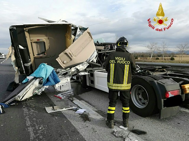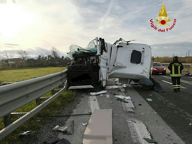 Incidente sulla variante Aurelia, corsia nord, tra Donoratico e La California, dove un trattore stradale ha tamponato la motrice di un camion che si trovava in sosta nella corsia di emergenza mandandola in frantumi. Nel mezzo parcheggiato non c'era nessuno a bordo
