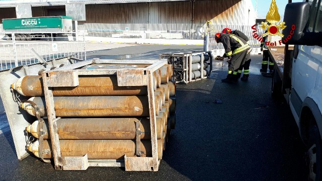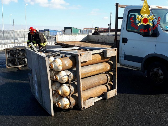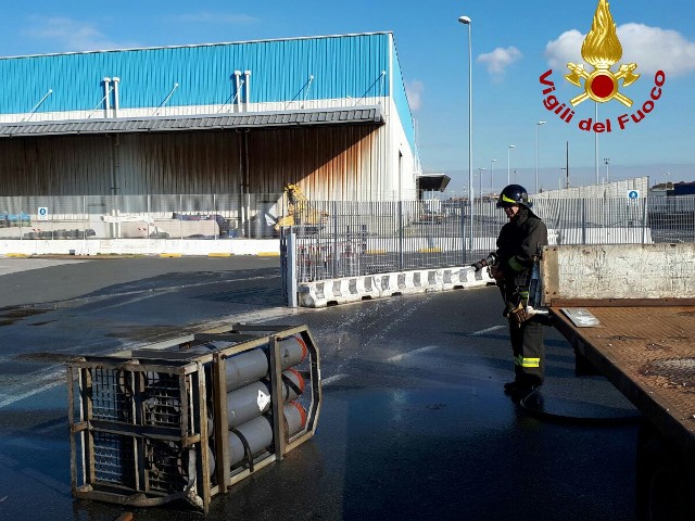 Due cestelli contenenti bombole con gas sono caduti da un camion al porto di Livorno, in zona Calata Carrara. Una bombola di acetilene si è rotta quest'oggi, richiamando l'intervento dei vigili del fuoco i quali hanno monitorato e perimetrato l'area con il nucleo nbcr (nucleare, biologico, chimico e radiologico). Il gas è stato fermato dopo la perdita e non vi sarebbero danni a cose o persone.