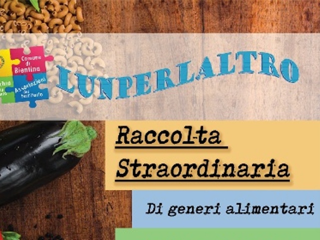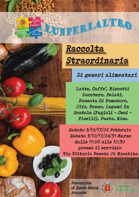 Una raccolta di beneficenza, per aiutare i più bisognosi, è in programma nel comune di Bientina. Nei giorni di sabato 3, 10, 17 e 24 febbraio e sabato 3, 10, 17, 24 e 31 marzo, dalle ore 11.00 alle 12,30, al servizio di via Vittorio Veneto numero 27, a Bientina, verrà effettuata la raccolta di generi alimentari straordinaria da parte del servizio Lunperlaltro.