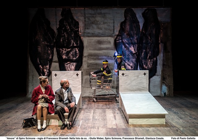 Con Amore, la compagnia Scimone Sframeli prosegue sul percorso drammaturgico ai bordi dell’umanità, all’interno di non luoghi, dove i personaggi non hanno nome e sono “tutti vecchietti”. Un altro tassello della loro ricerca “verso l’essenza del teatro, non perdendo mai il legame fra gli attori, il testo e il pubblico”.