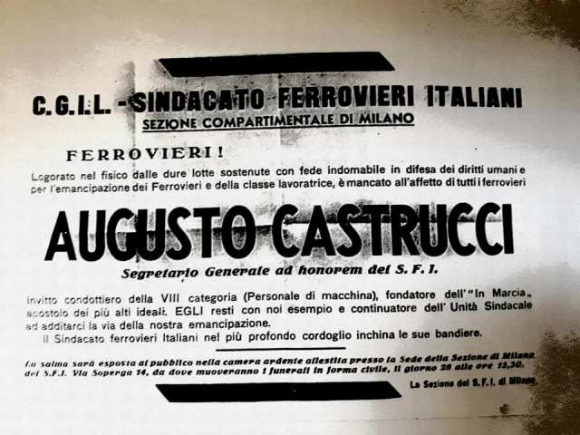 vita: aggredito una prima volta nel gennaio 1922, nell’agosto dello stesso anno la sua casa venne devastata da una banda di fascisti; il 4 agosto 1922 in piazza Vittorio Emanuele comparve un manifesto che lo condannava a morte: la scelta di trasferirsi con la famiglia fu obbligata. Si spostò quindi a Milano e pochi mesi dopo il regime decretò il suo licenziamento, ufficialmente per scarso rendimento, in realtà per ragioni politiche. Ciò nonostante Castrucci continuò a dirigere il giornale fino al 1926, quando il fascismo dopo aver imposto lo scioglimento del Sindacato Ferrovieri ordinò anche la chiusura della rivista “In marcia!”, su cui Castrucci aveva continuato a scrivere articoli di critica e denuncia.