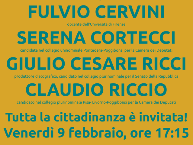 Venerdì 9 febbraio inizia anche a Volterra la campagna elettorale di Liberi e Uguali con Pietro Grasso, la lista unica della sinistra: presso il circolo ARCI Garofano Rosso in via San Lino 8, a partire dalle ore 17, si svolgerà il dibattito pubblico “C'è alternativa! Cultura e saperi, c'è una nuova proposta”. Al dibattito è invitata l'intera cittadinanza, in modo particolare gli esponenti di associazioni del territorio e i lavoratori del mondo della cultura. Introdurrà l'evento il prof. Fulvio Cervini dell'Università di Firenze, docente in storia dell'arte. Prenderanno la parola alcuni candidati di Liberi e Uguali sul territorio: Serena Cortecci, Claudio Riccio e Giulio Cesare Ricci. Cortecci è candidata per il collegio uninominale di Pontedera-Poggibonsi della Camera dei Deputati, del quale fa parte tutta l'alta val di Cecina: originaria di Colle Val d'Elsa, laureatasi in giurisprudenza nel 1985, è insegnante di scuola superiore. È stata assessore alle politiche educative del comune di Poggibonsi. Claudio Riccio, barese di 32 anni, è stato esponente dei movimenti studenteschi nelle battaglie contro la Legge Gelmini, prima di diventare partita IVA e lavoratore autonomo. Esponente nazionale di SI, è candidato nella lista LEU del collegio proporzionale che comprende le province di Pisa e Livorno, per la Camera dei Deputati. Viene invece da Peccioli il produttore discografico e fondatore della casa Foné, Giulio Cesare Ricci: è candidato di Liberi e Uguali al Senato della Repubblica nel listino proporzionale della Toscana meridionale.
