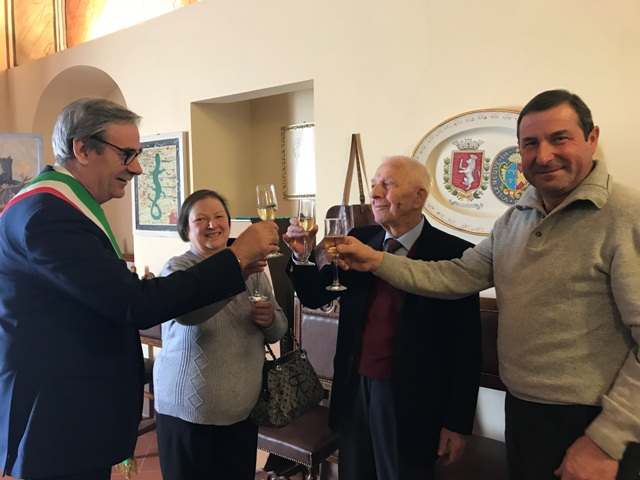 Cento anni e non sentirli. E' il caso di Gino Daini, classe 1918 (8 febbraio), originario di Corazzano che questa mattina ha voluto essere presente in Palazzo Comunale per festeggiare questo straordinario traguardo insieme al sindaco di San Miniato Vittorio Gabbanini. Ad accoglierlo in Sala del Consiglio molti amici, conoscenti e concittadini della frazione che, insieme ai figli Adriana e Paolo e ai tre nipoti Samuele, Silvia e Gabriele, hanno festeggiato i suoi cento anni con un brindisi.