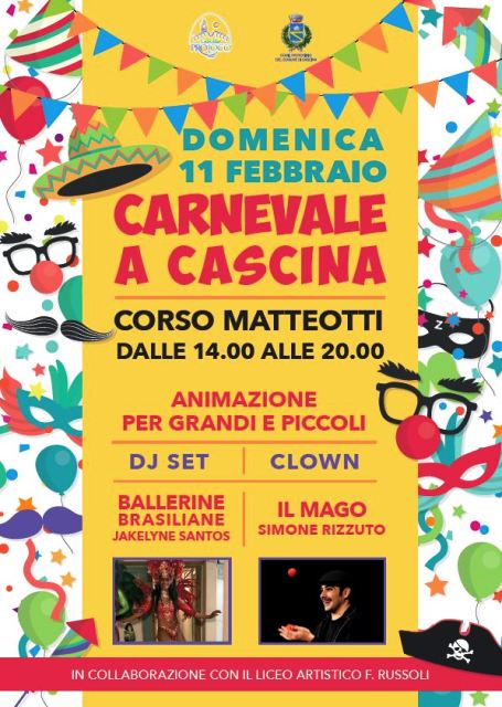 Domenica 11 febbraio 2018, dalle ore 14 alle ore 20, in corso Matteotti "Carnevale a Cascina" con animazione per grandi e piccini, con il mago Simone Rizzuto, clown, dj set, spettacolo con le ballerine brasiliane Jakelyne Santos. L'evento è realizzato dalla Pro Loco Cascina e dal Comune di Cascina, in collaborazione con il liceo artistico "Russoli".