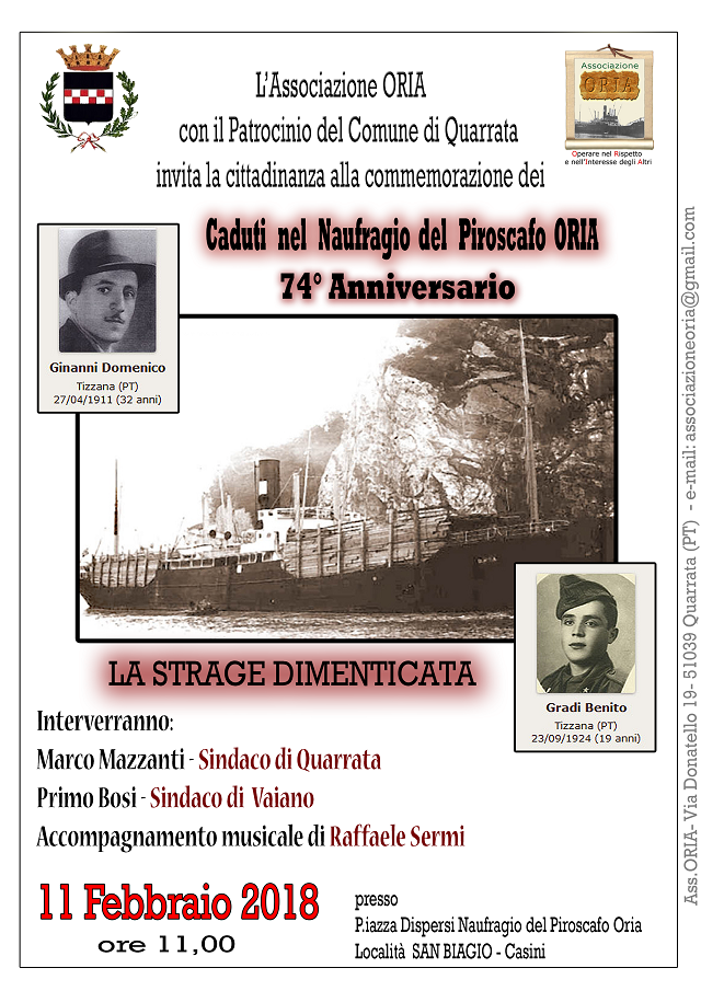 L'Associazione Oria, con il Patrocinio del Comune di Quarrata, invita le associazioni e la cittadinanza alla Commemorazione dei Dispersi nel Naufragio del Piroscafo Oria.